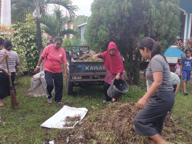 Bersama ibu-ibu Majelis Taslim, umat KBG membersihkan lingkungan Masjid YAM Nurul Salam Wangatoa, Jumat (28/03/2025) pagi.